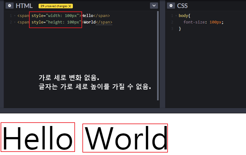 : span 태그에 css 속성을 설정해줘도 글자는 가로 세로 높이를 가질수 없으므로 변화하지 않는다.