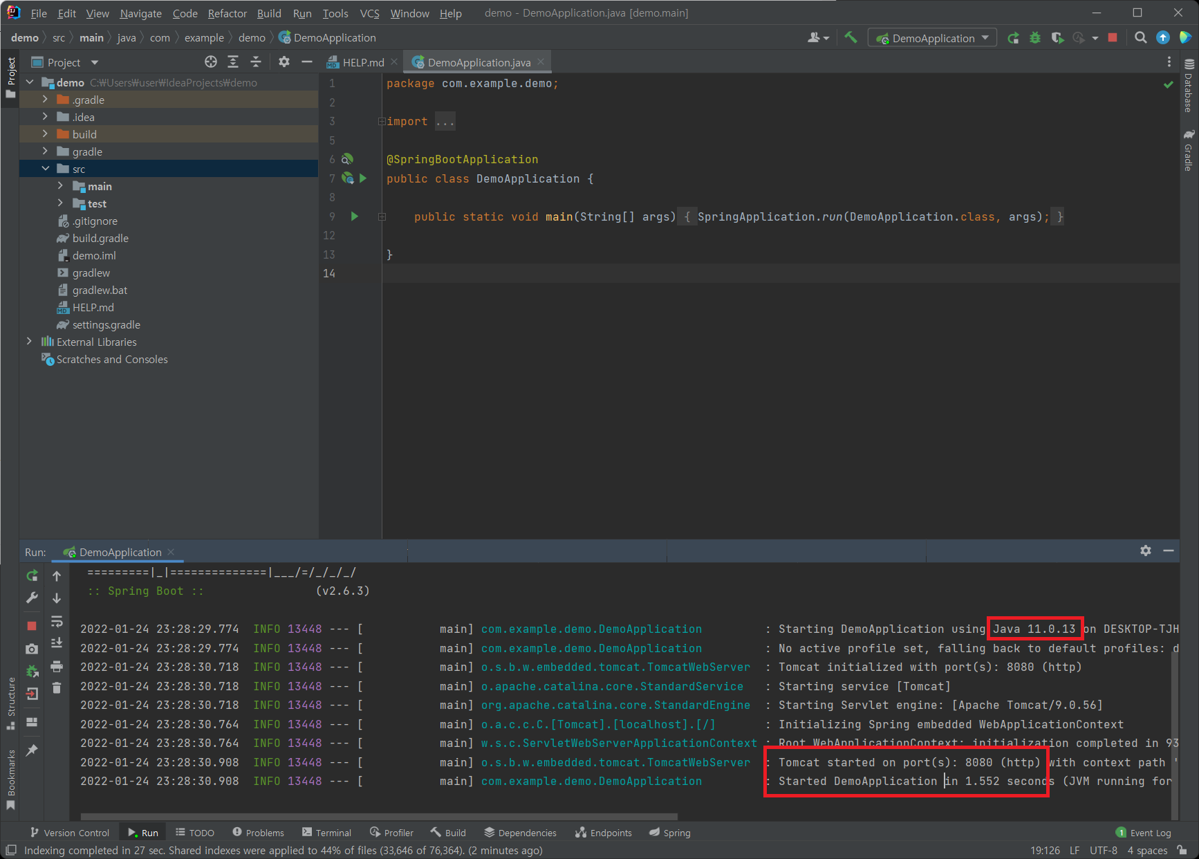 8080포트로 Start DemoApplication이 실행된다.
