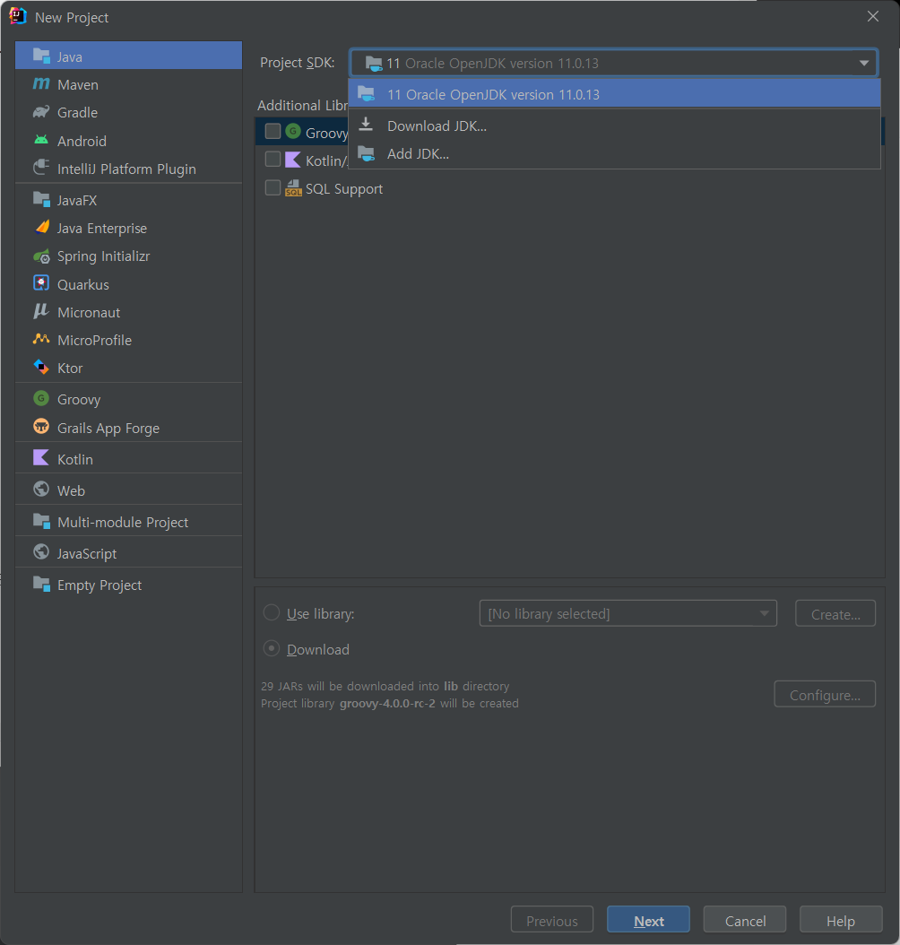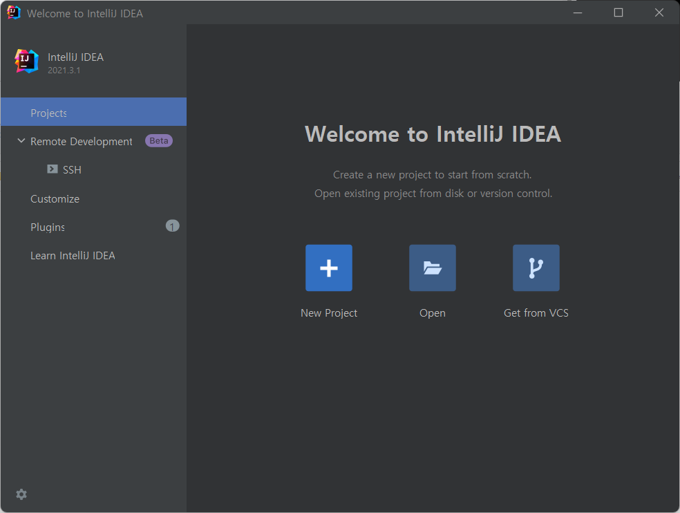 New Project를 눌러서 자바Java가 제대로 설치되었는지 확인한다.