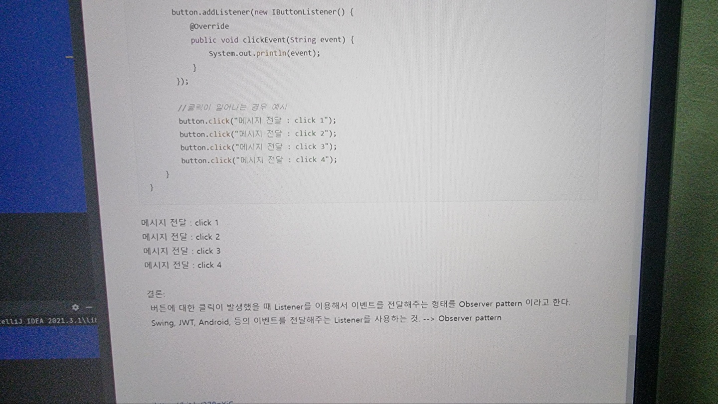 버튼에 대한 클릭이 발생했을 때 Listener를 이용해서 이벤트를 전달해주는 형태를 Observer pattern 이라고 한다.