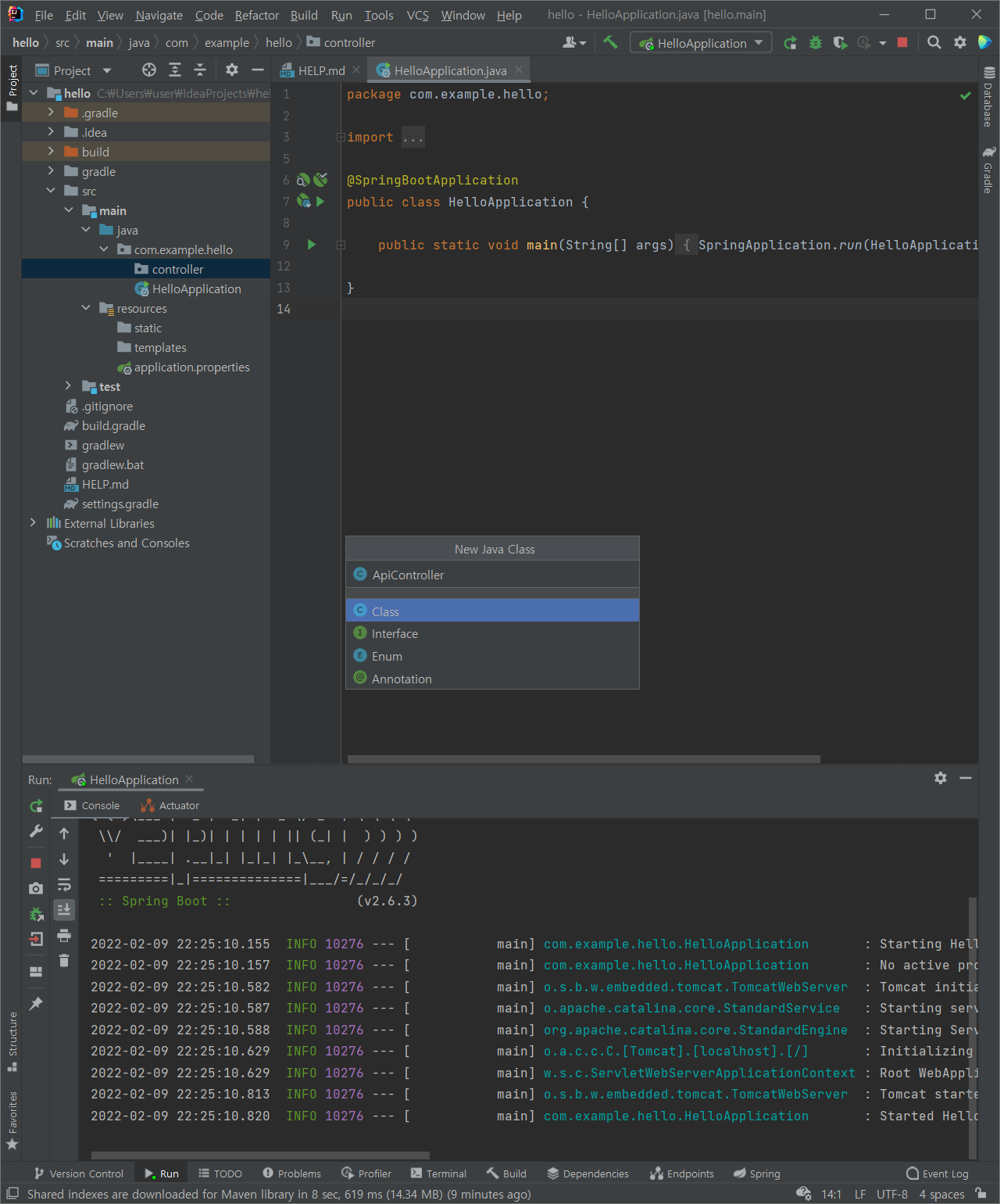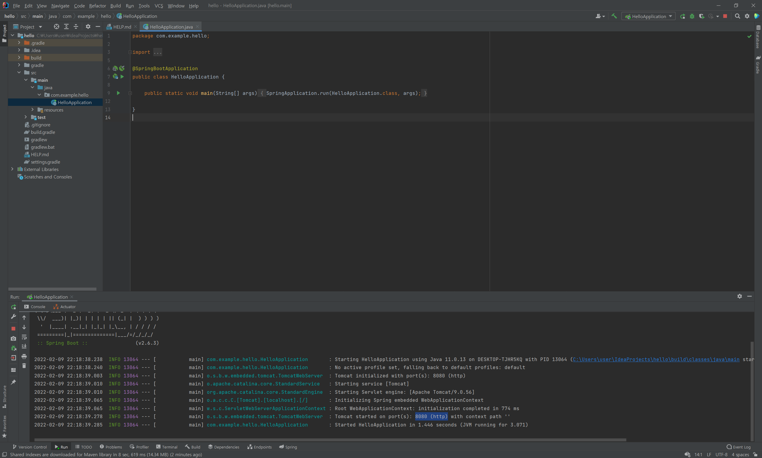 (3) hello > src > main > java > com.example.hello > HelloApplication 를 Run 해본다 (단축키: Ctrl + Shift + F10)