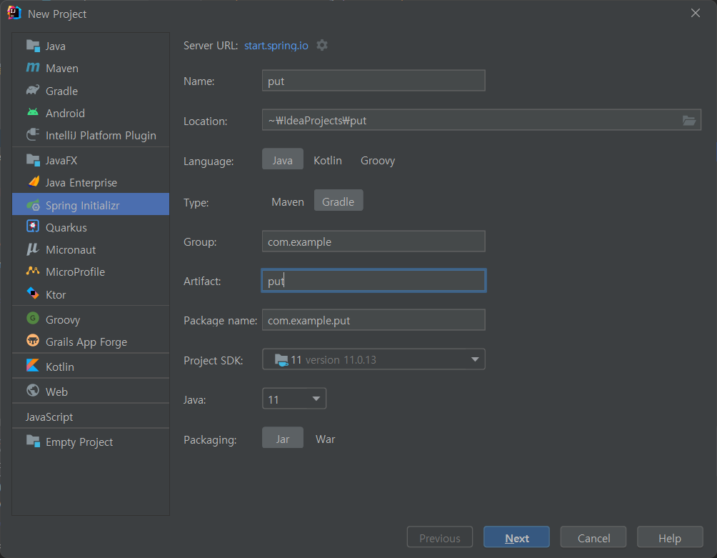: Artifact : put, Language: Java, Type: Gradle, Java: 11, Packaging: Jar