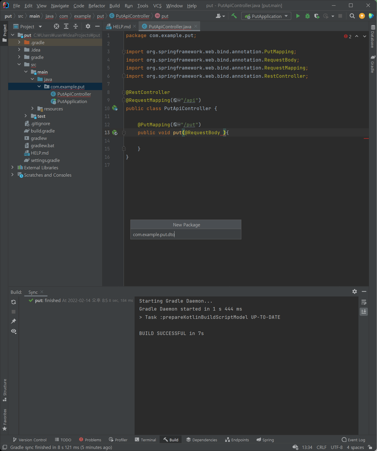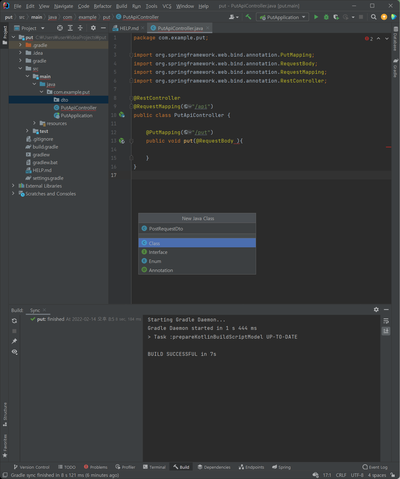 (2) src > main > java > com.example.put 경로에 PutApiController 클래스 추가