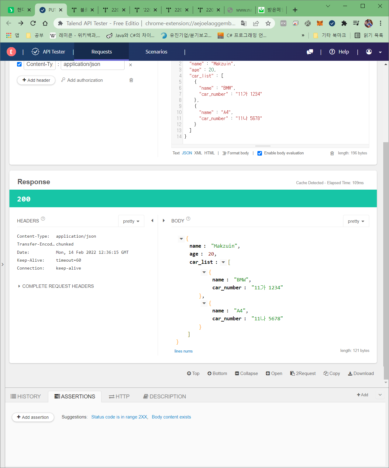 결과: Response 에서도 json 형태로 잘 전달 된 것을 볼 수 있다.