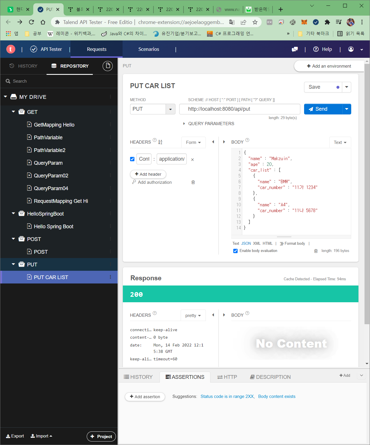 http://localhost:8080/api/put/100 로 Talend API에서 put요청을 보낸다~