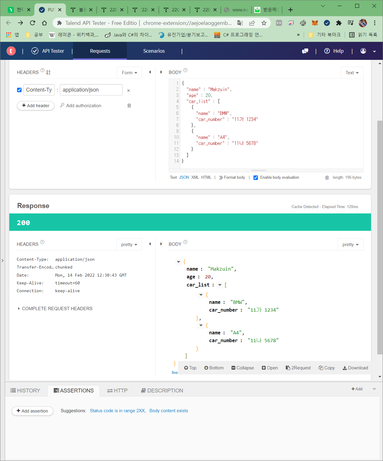 PostRequestDto{name='Makzuin', age=20, carList=[CarDto{name='BMW', carNumber='11가 1234'}, CarDto{name='A4', carNumber='11나 5678'}]}