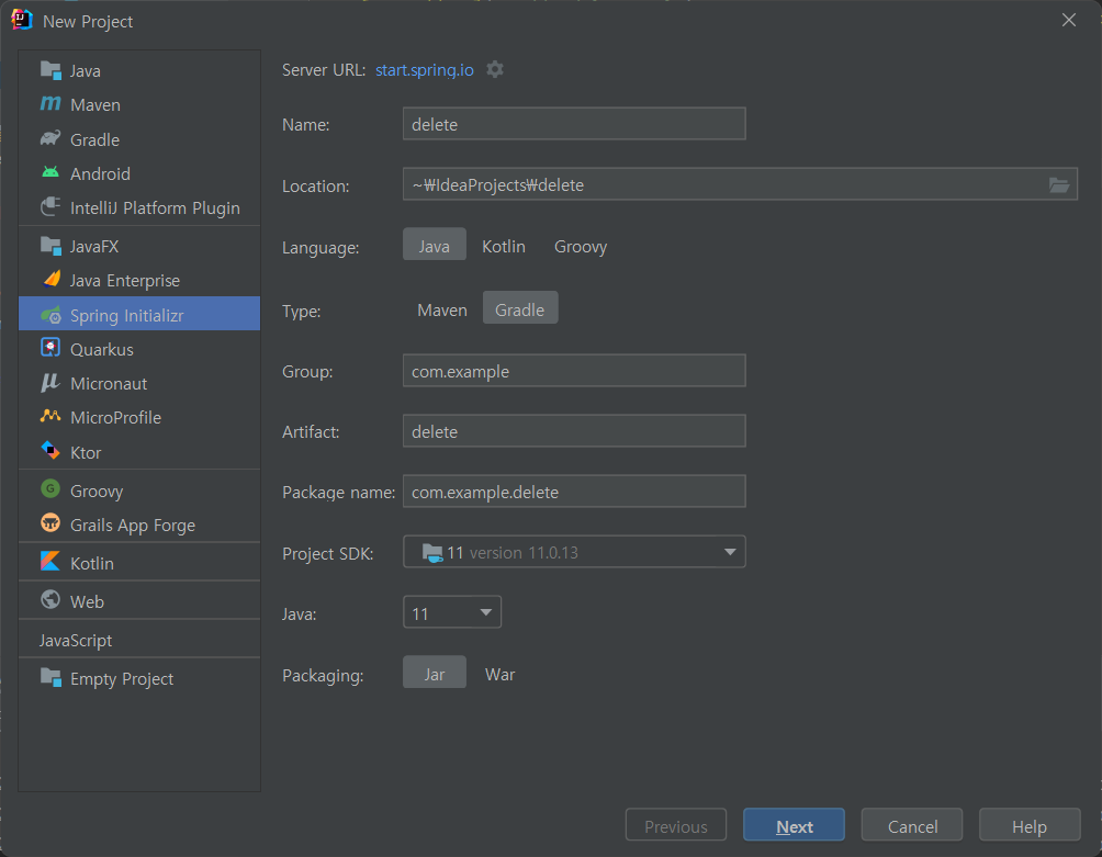 : Language : Java, Type: Gradle, Artifact: delete, Java: 11, Packaging: Jar