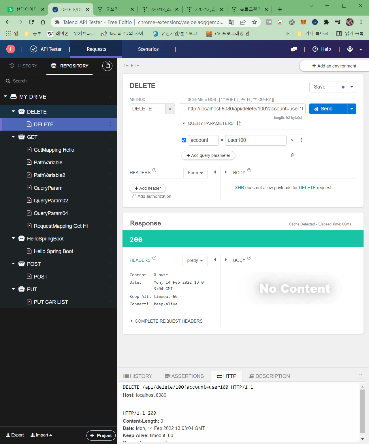 http://localhost:8080/api/delete/100?account=user100 으로 DELETE 요청을 보내보자