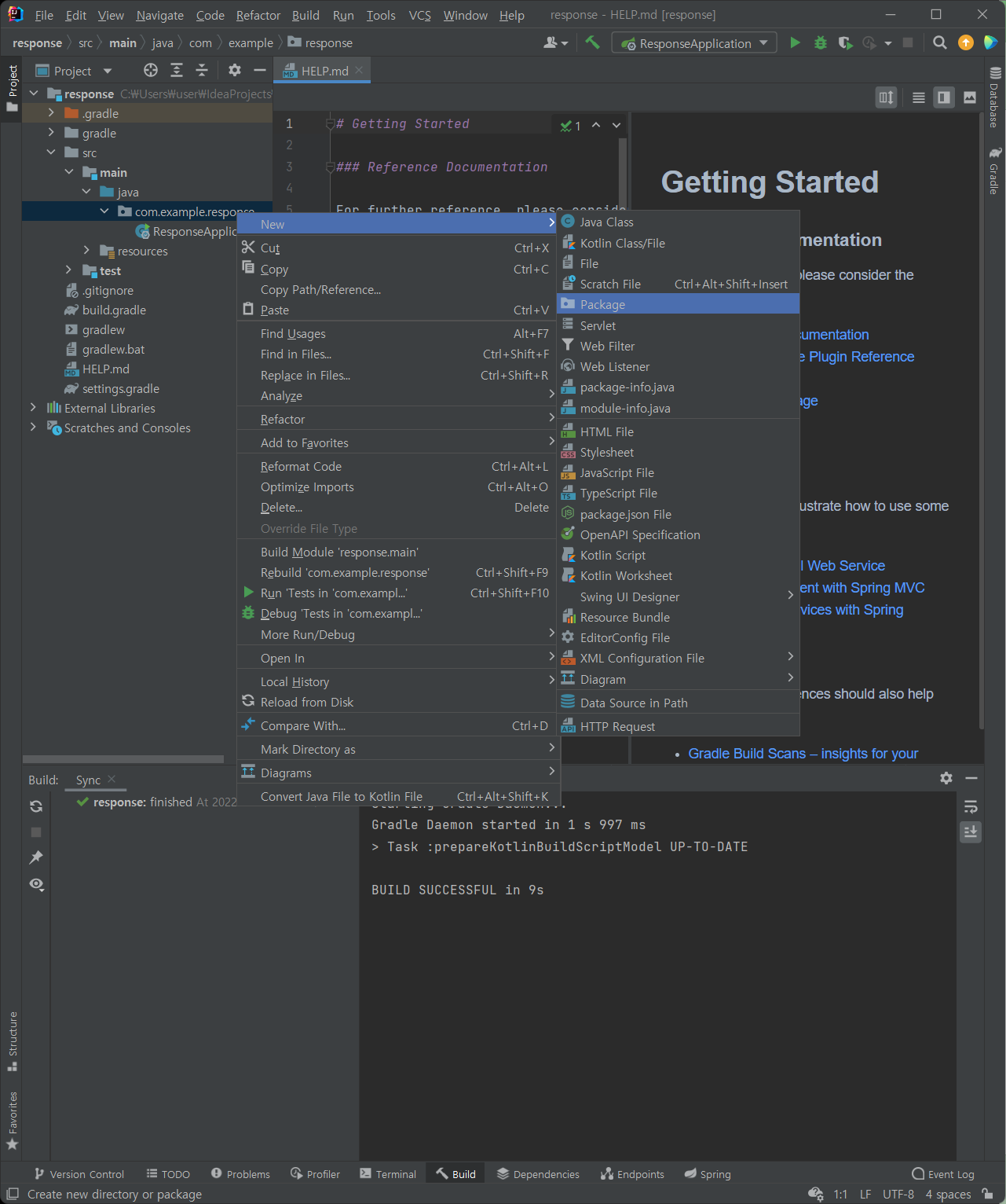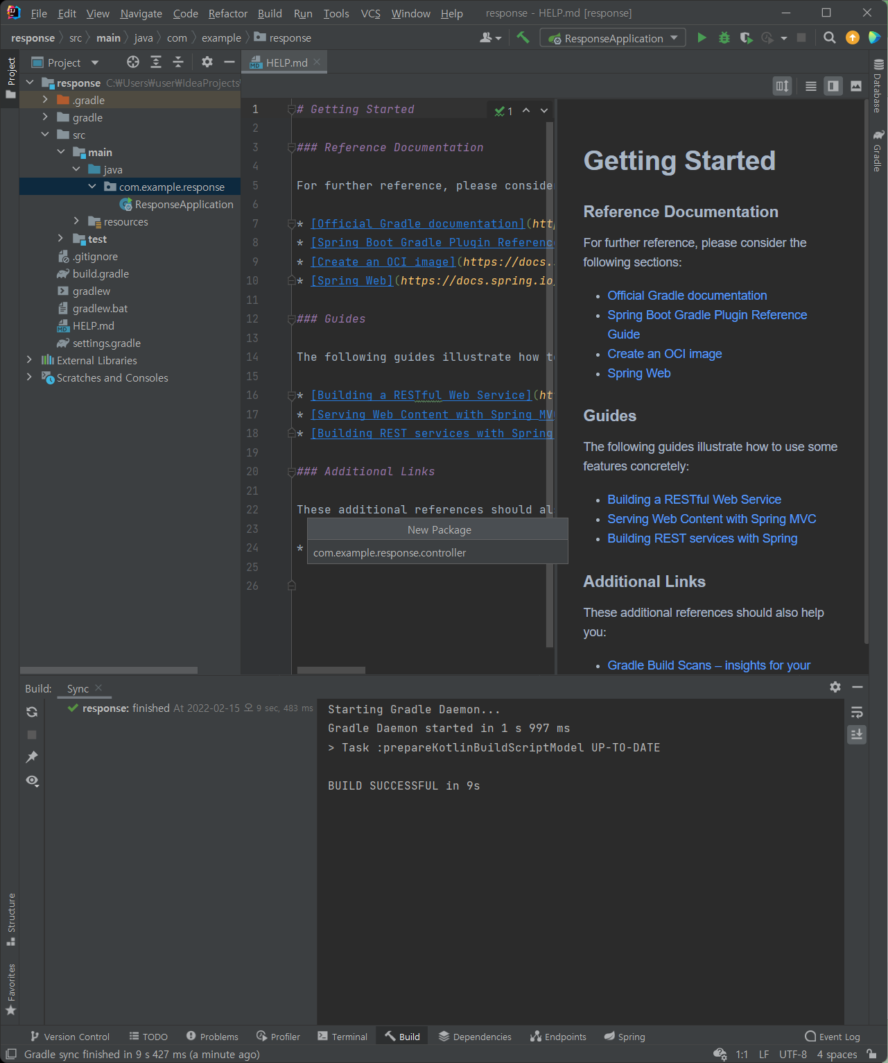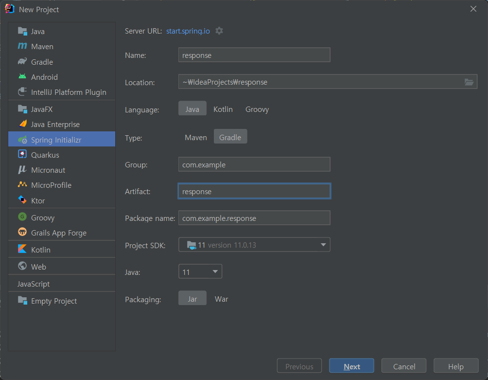 : Language(Java), Type(Gradle), Artifact(response), Java(11), Packaging(Jar)
