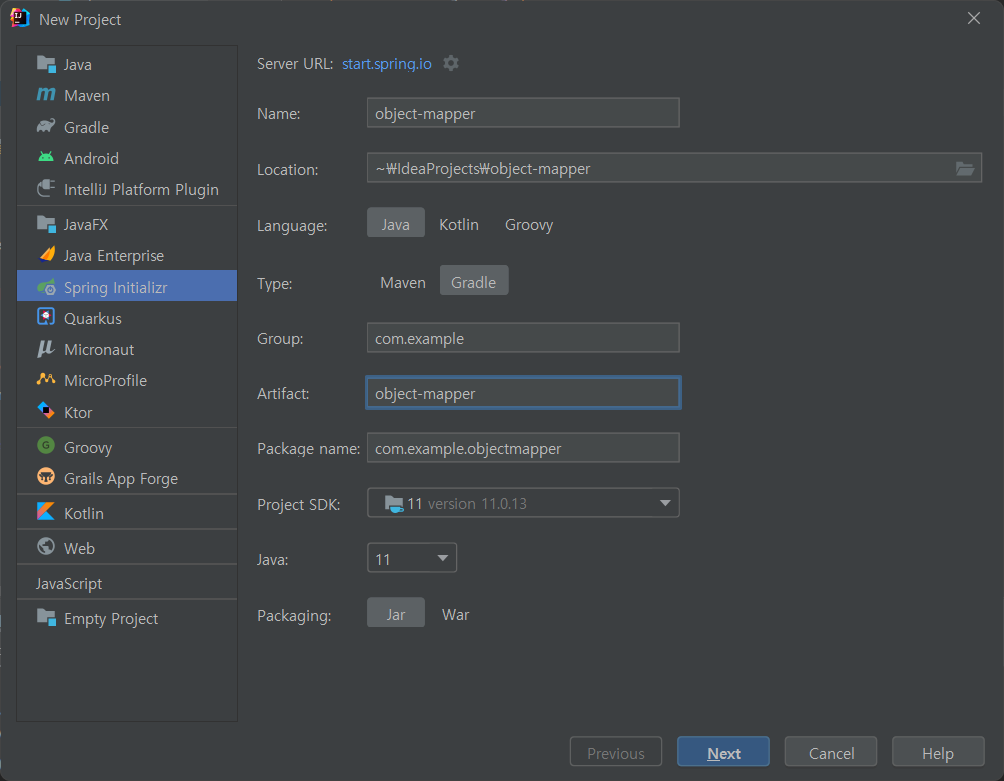 : Language(Java), Type(Gradle), Artifact(object-mapper), Java(11), Packaging(Jar) Next 클릭