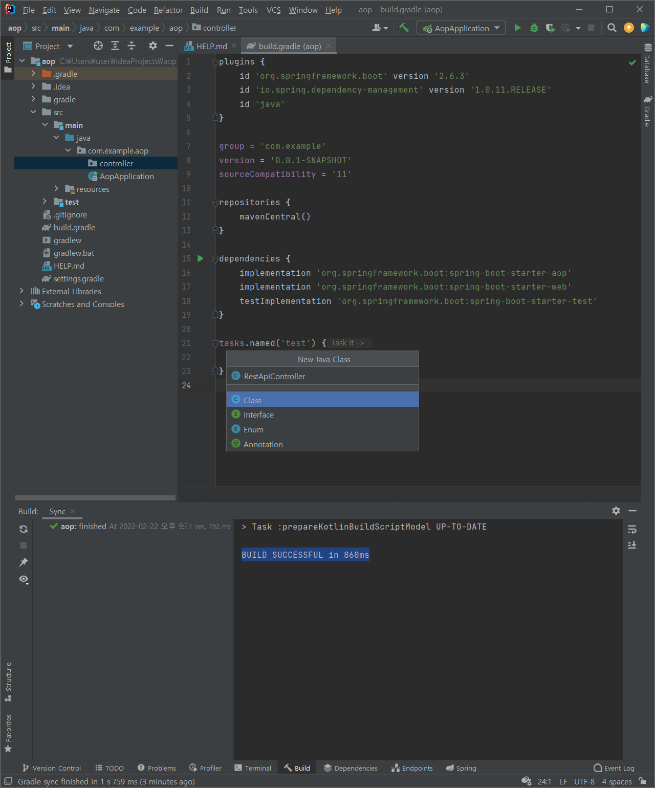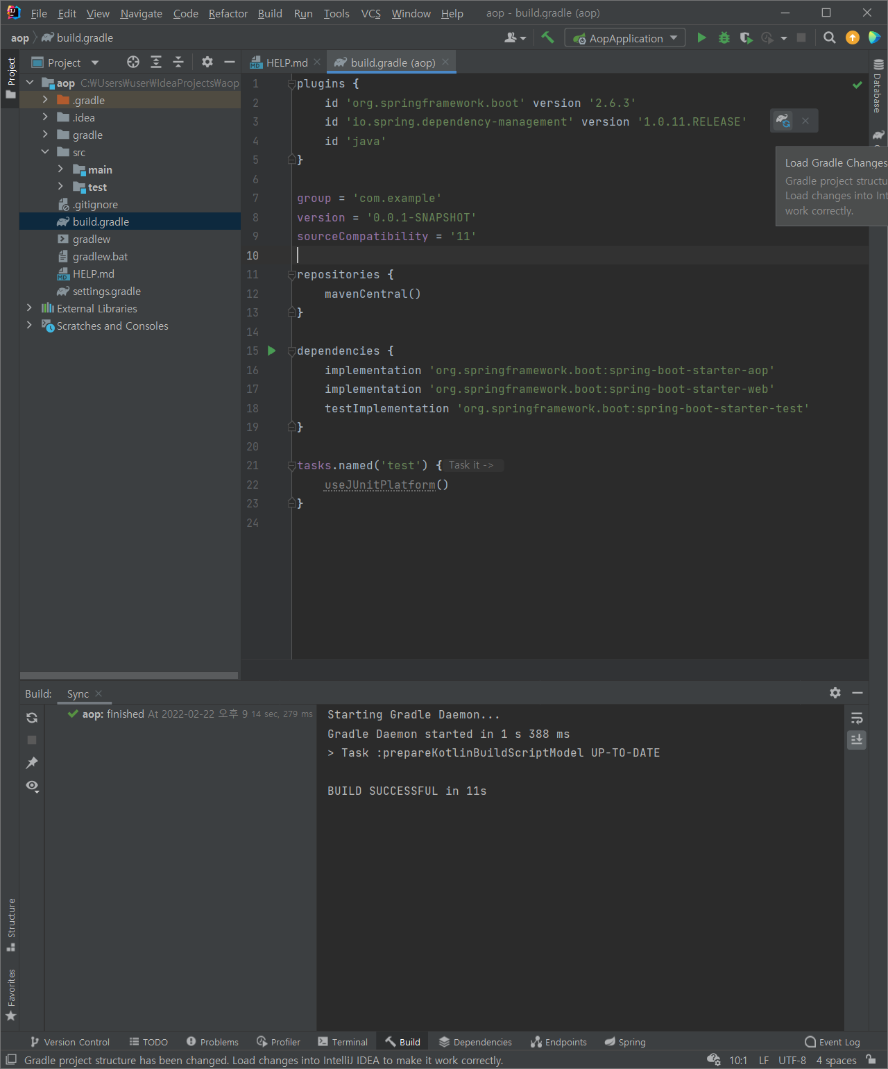 : bundle.gradle > (다음 문장 추가) implementation 'org.springframework.boot:spring-boot-starter-aop'