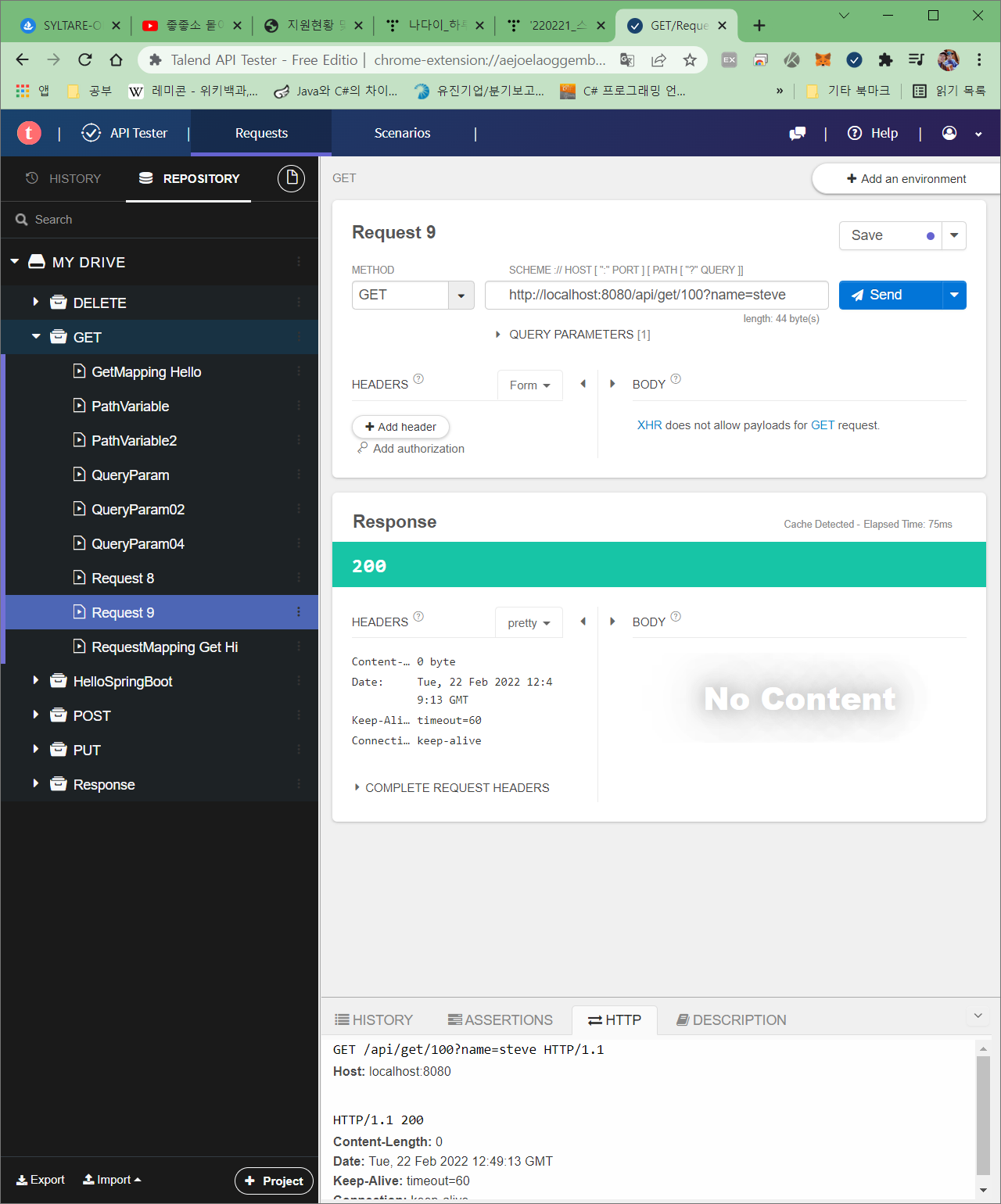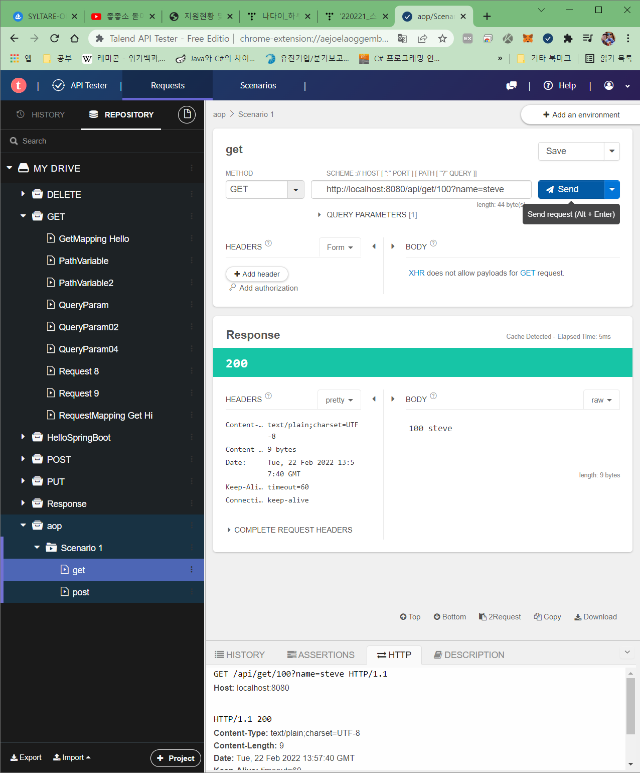 Talend API > (GET) http://localhost:8080/api/get/100?name=steve
