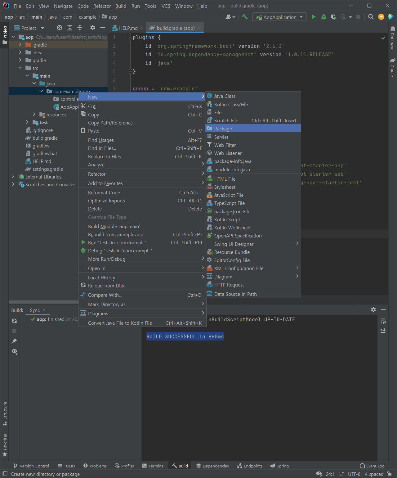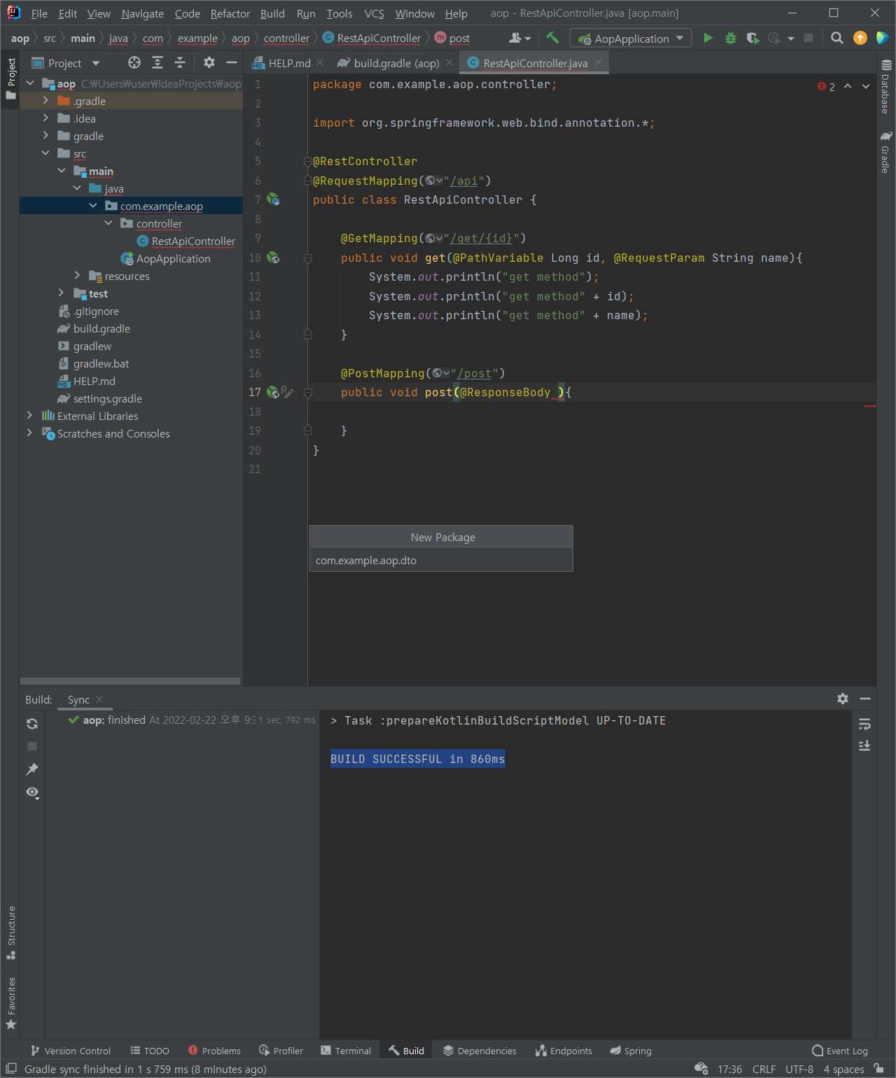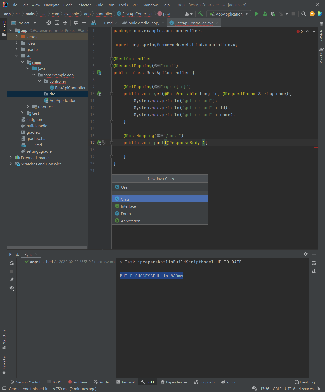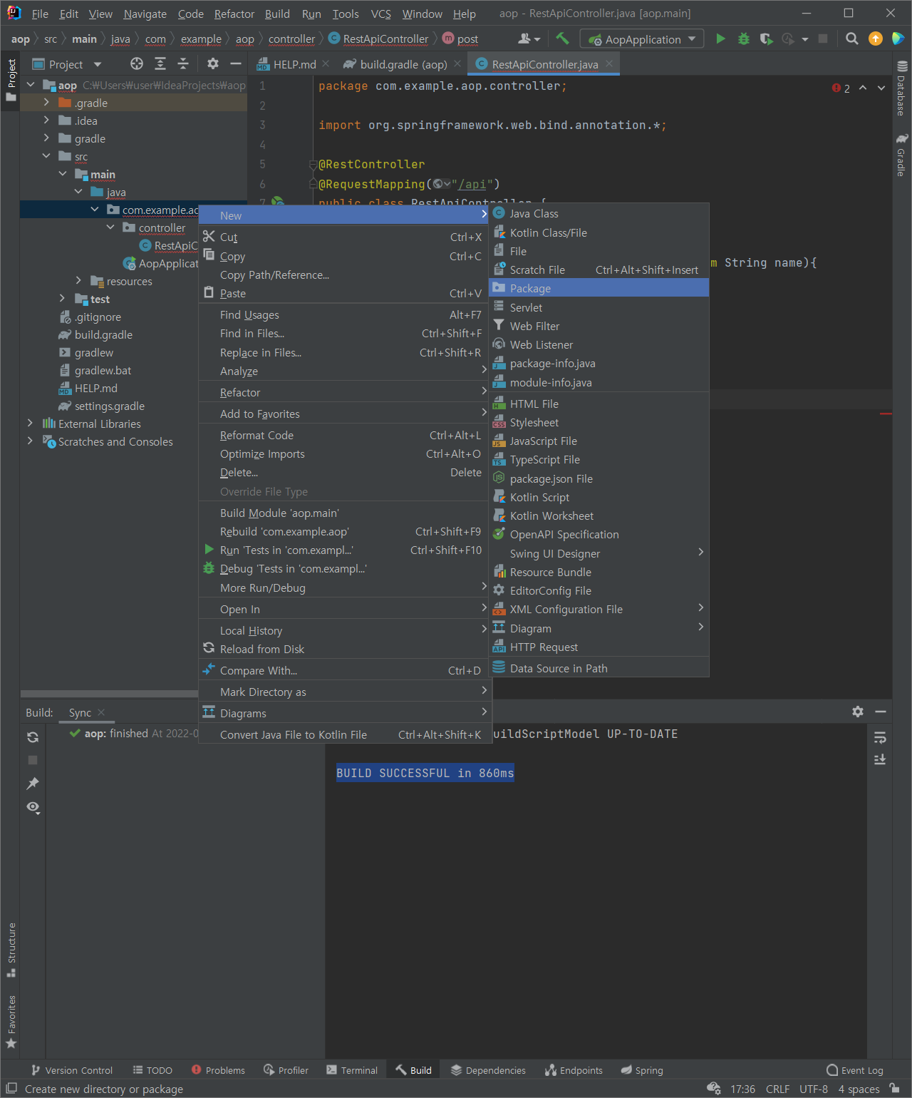 : 상단의 새로고침 클릭 : BUILD SUCCESSFUL in 860ms