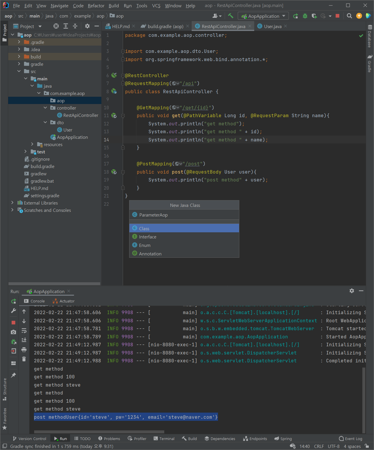 (8) aop 패키지 추가 > ParameterAop 클래스 추가