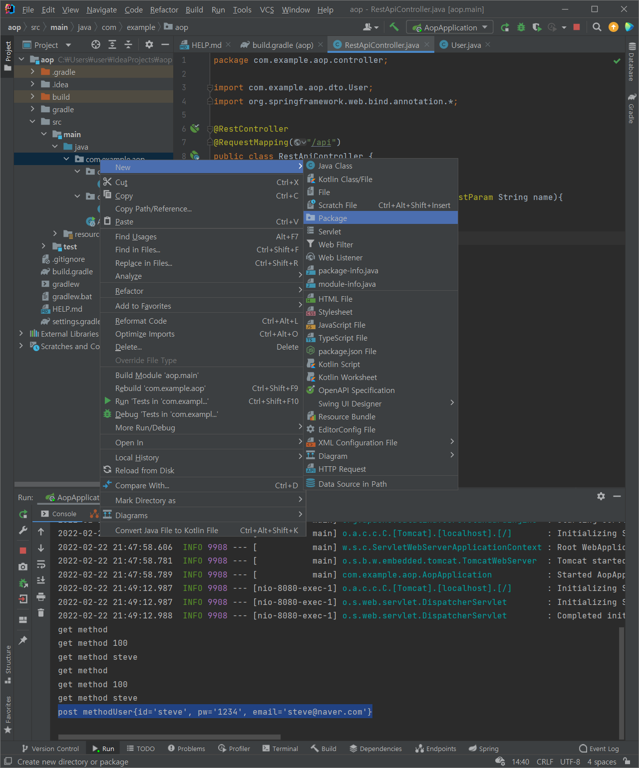 (3) controller 패키지 추가 > RestApiController 자바 클래스 추가