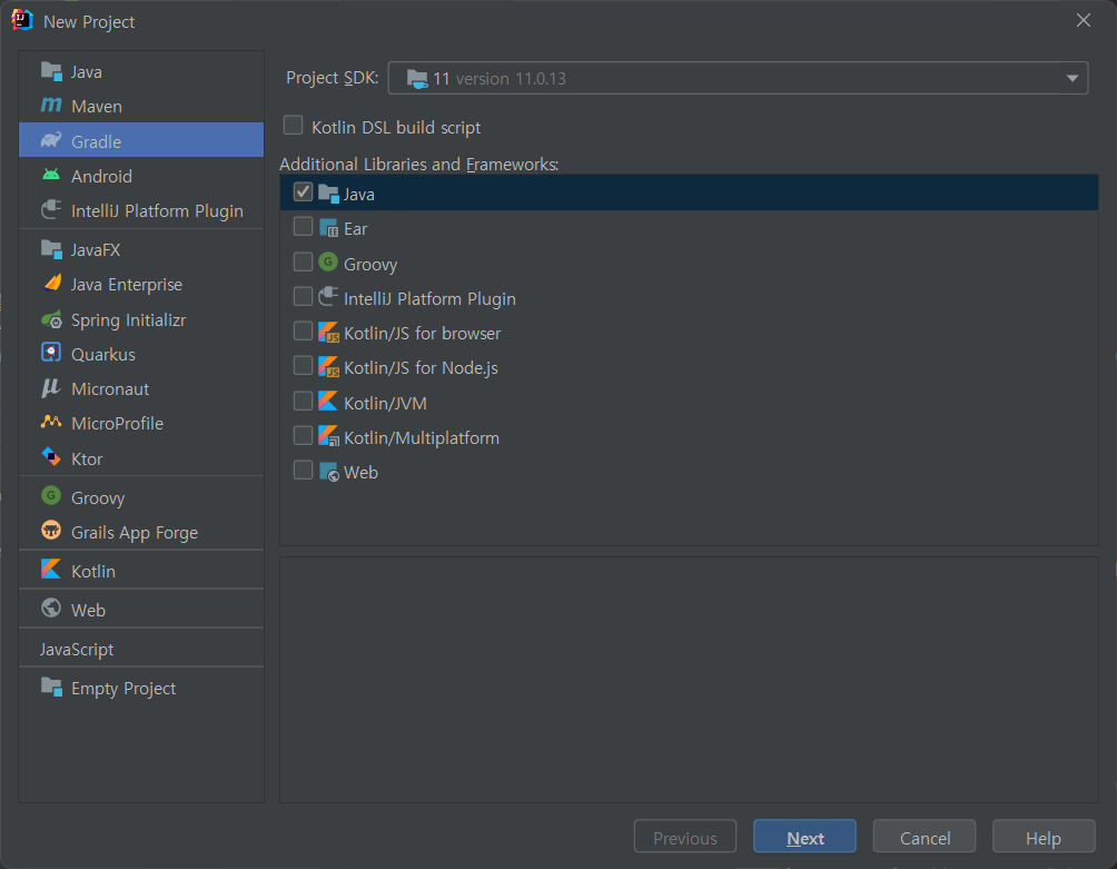 (1) File > New > Project > Gradle > Java 체크 > Next 클릭
