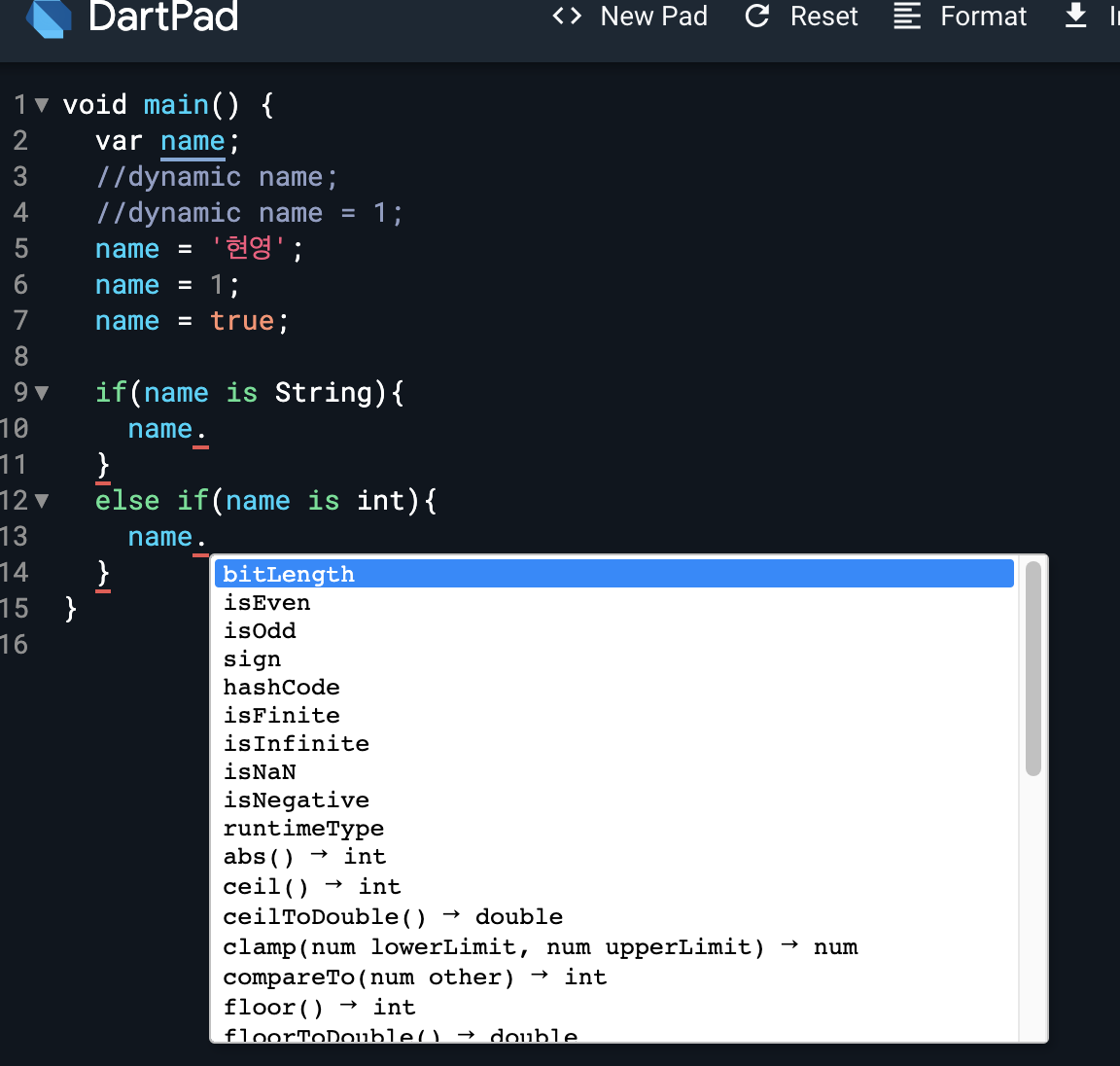 : dynamic 타입의 변수는 dart가 변수의 타입을 특정할 수 없어서 메소드가 많이 나오지 않는다 따라서, 조건문 등을 이용해 변수의 타입을 특정하여, 특정 된 해당 타입의 메소드를 사용 가능하다.