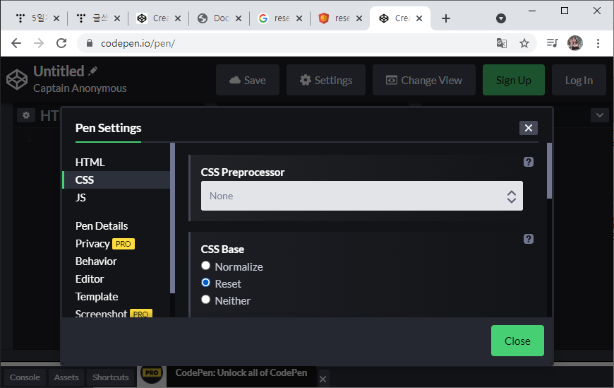 그렇다면 codepen.io에서는 이를 어떻게 적용할까?
