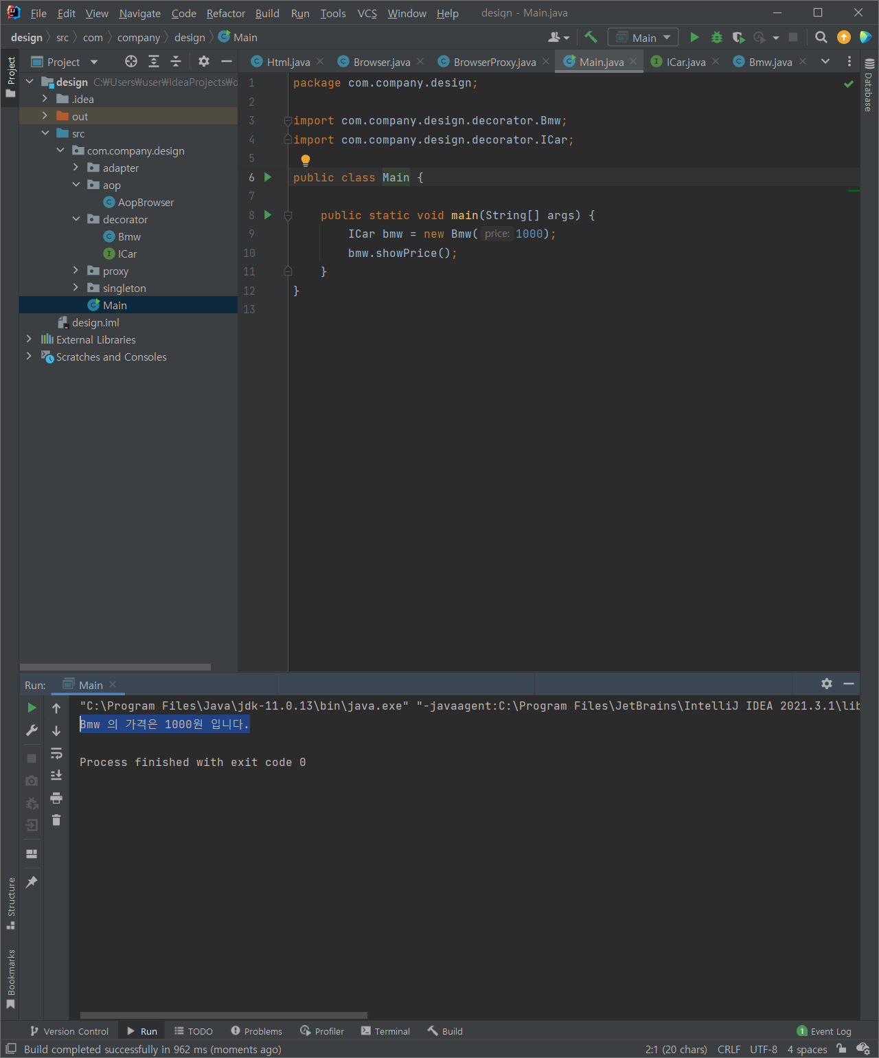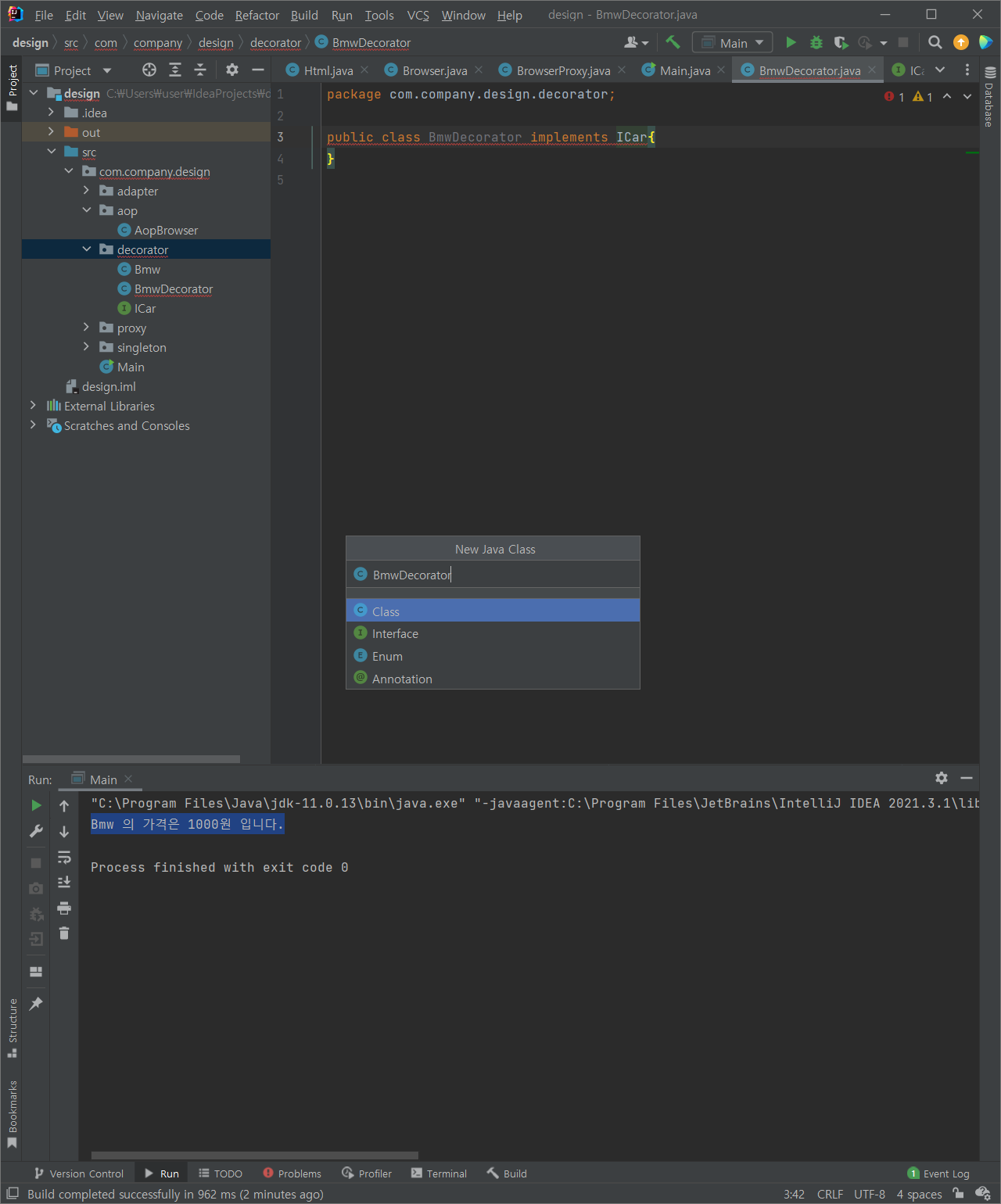 (1) com.company.design 패키지에 decorator 패키지 추가 & 해당 패키지에 ICar 인터페이스 추가