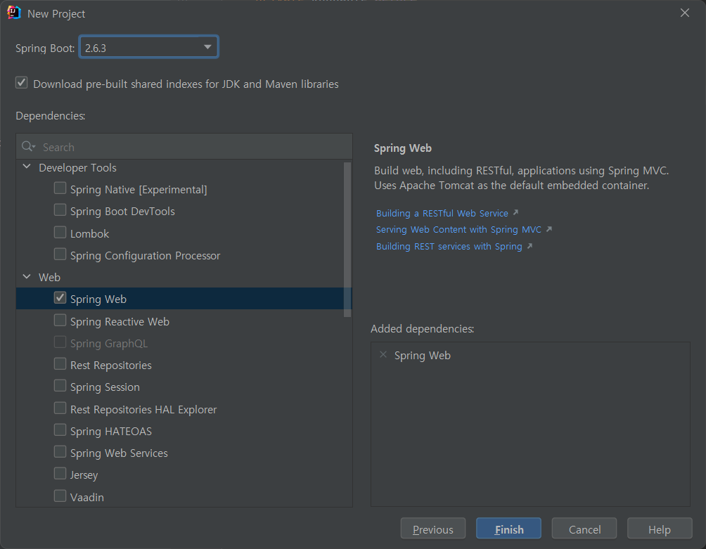 (2) Web > Spring Web 선택, Spring Boot: 2.6.3 선택 후 Finish
