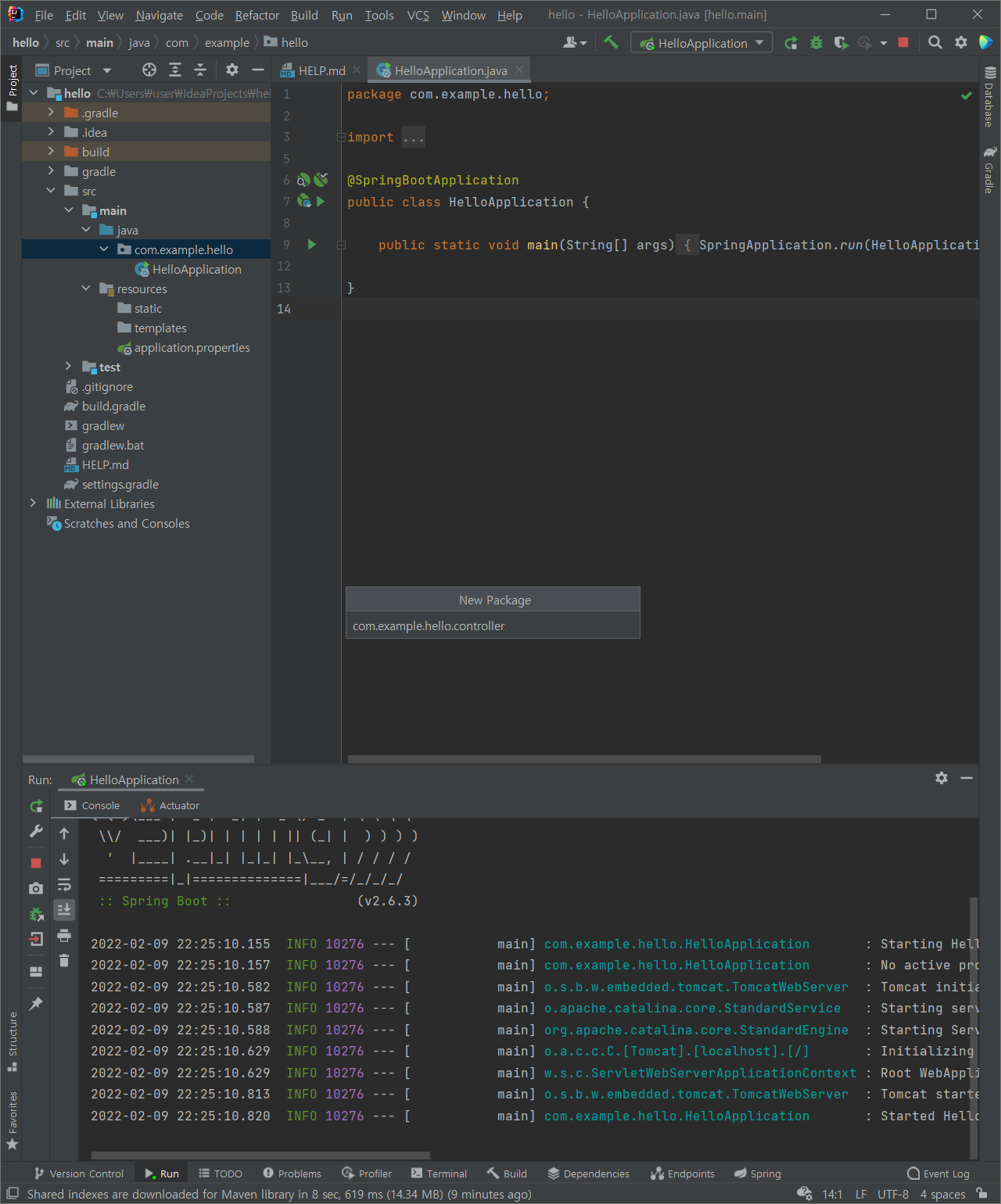 (3) hello > src > main > java > com.example.hello > HelloApplication 를 Run 해본다 (단축키: Ctrl + Shift + F10)