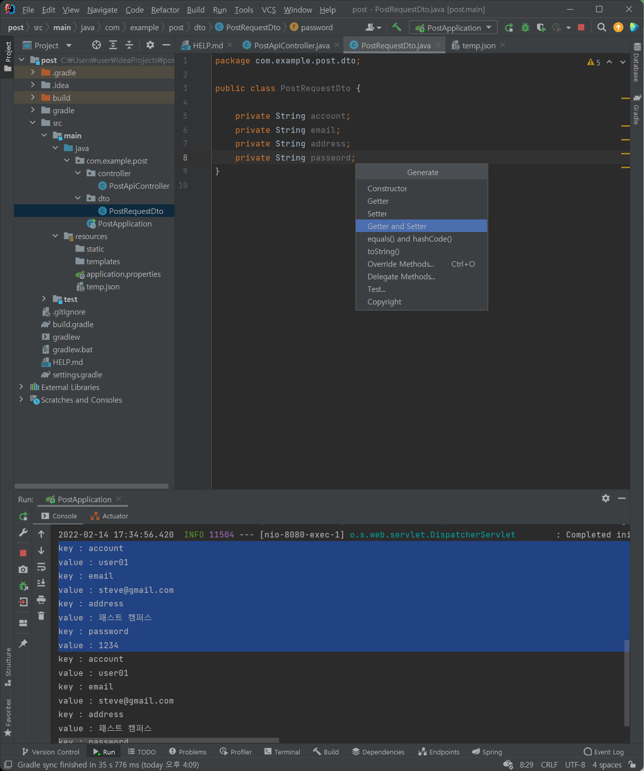 (8) Dto를 파라미터로 갖는 post()메소드를 오버로딩해 작성했다 (url은 /post-dto 로 매핑)