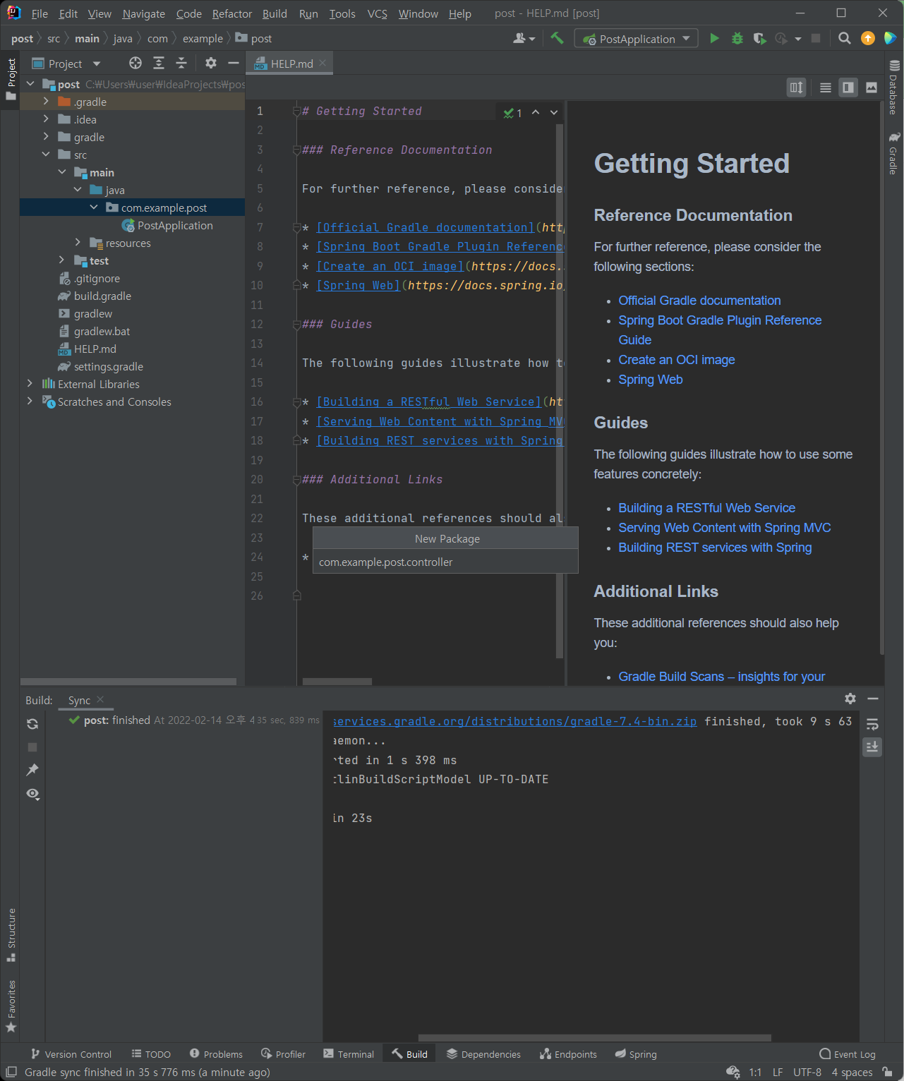 : Artifact: post, Java: 11, Language: Java, Type: Gradle, Packaging: Jar