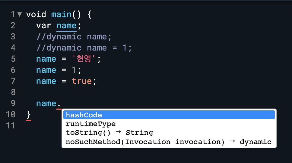 : dynamic 타입의 변수는 dart가 변수의 타입을 특정할 수 없어서 메소드가 많이 나오지 않는다 따라서, 조건문 등을 이용해 변수의 타입을 특정하여, 특정 된 해당 타입의 메소드를 사용 가능하다.