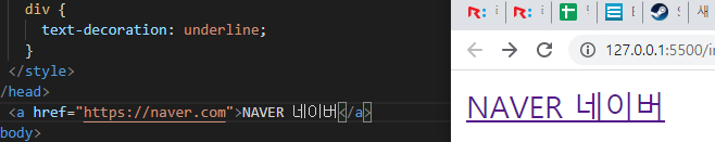 페이지 나누고 연결(링크)하기 태그 NAVER 네이버 : 태그 내부에 있는 글자에 href의 링크로 이동하도록 버튼이 생성됨 : 경로 '/' 앞에는 접근 가능한 기본 주소가 생략되어있다 About : 루트 폴더 아래의 about폴더 안에 about.html 파일이 존재하면 해당 링크로 이동 가능하다 : http://127.0.0.1:5500/about/about.html : 브라우저는 해당 경로가 폴더까지만 지정되었을 경우, index.html을 자동으로 찾아서 띄워주게된다. 예) About About2 : 두 사례 모두 같은 about 폴더 내의 index.html 화면을 보여주게 된다. Home : 루트 경로에 있는 index.html로 이동하게 된다. ※ 주소의 about이 항상 폴더라고 단정할 수..