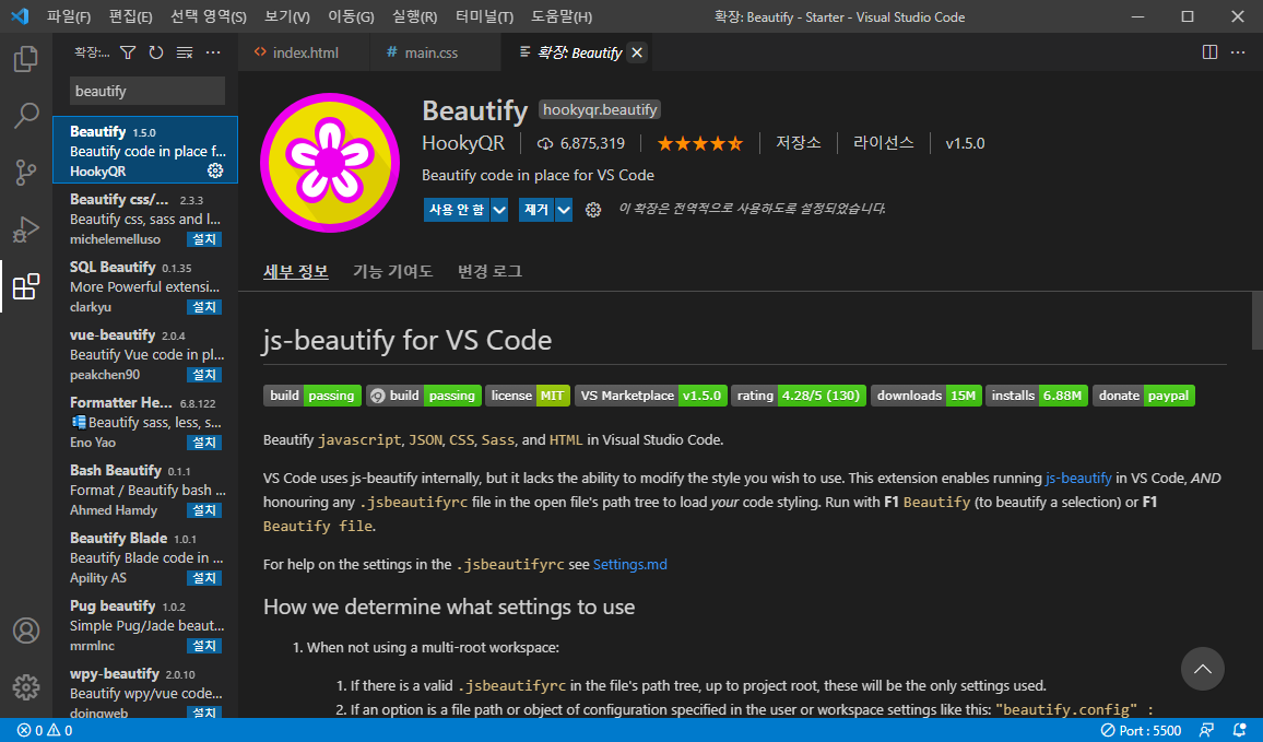 1일차_VS Code에 설정해 놓은 정리된 코드 만들기 Beautify_20210622 VS Code에 설정해 놓은 정리된 코드 만들기 Beautify 사이드바의 확장에서 Beautify 검색하면 나온다. 설치 후 단축키를 Ctrl + Alt + l(알파벳 소문자 엘) 설정하고 입력하면 코드 자동 정리 실행 개발새발/VS Code 2021.06.22